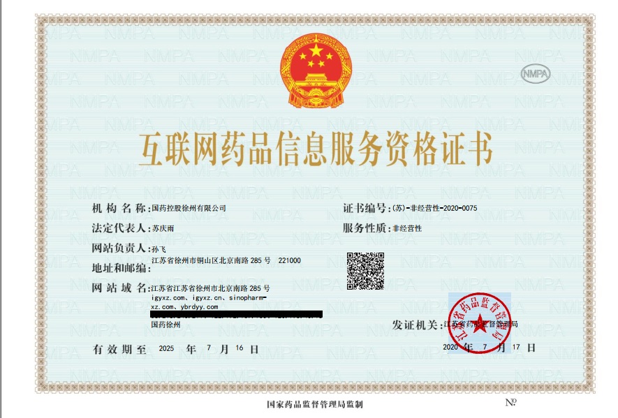 0516-8010-1098 江蘇省徐州市高新技術開發(fā)區(qū) 北京南路283號萬泰廣場1號樓7-13層 互聯網藥品信息服務資格證書